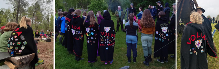 Voldaspeidarane brukar svart ullstoff med raudt kantband og eit stort forbundslogo til leirbålskappene sine.